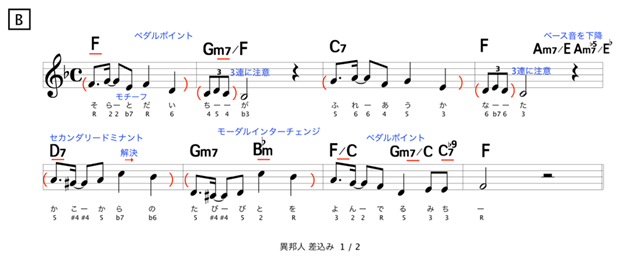 最後に7小節目F/CーGm7/CーC7(b9)ではサビ頭と同様にペダルポイントを使用して広がりを作り出し、Fに解決をしている。