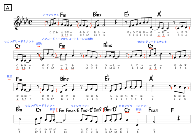 メロディラインとしてはFmスケールを使用してコードトーンを中心に展開しているが、小節の頭ではノンコードトーンから始まりコードトーンに着地するというユニークなライン。またメロディラインが3拍目裏からアウフタクトで始まる事が多い点にも注目。3、8小節目のみ1拍目裏からのスタートなるがアウフタクトとそうでない時のノリの違いを感じて欲しい。